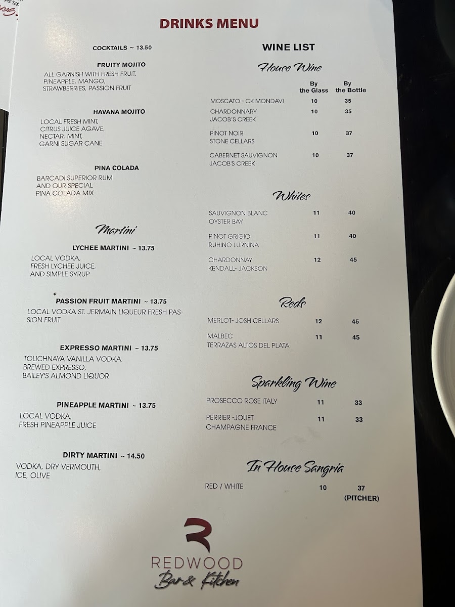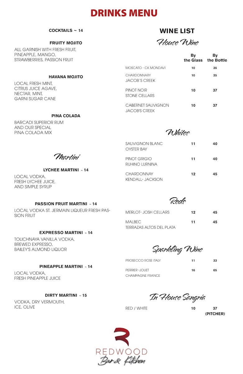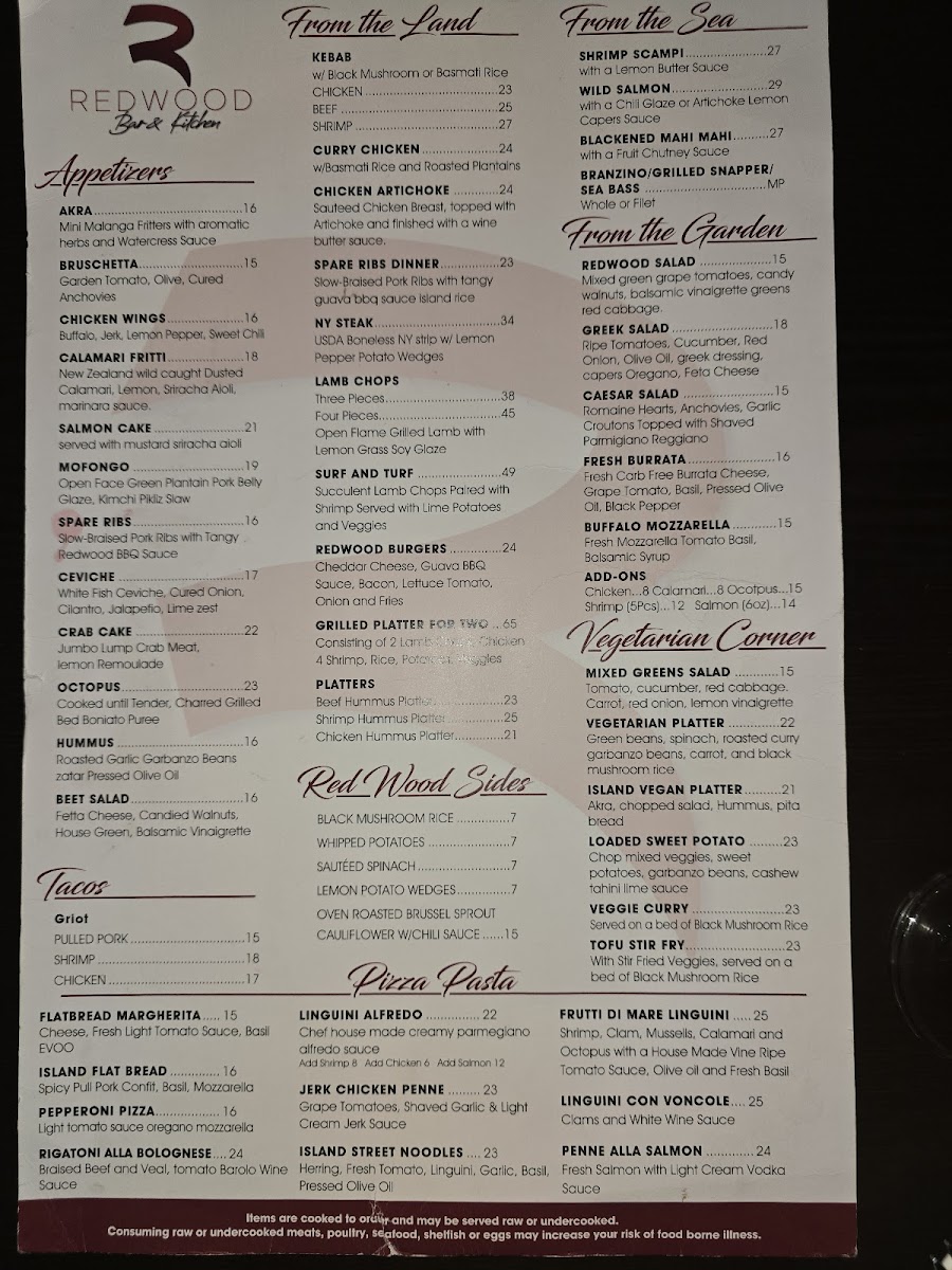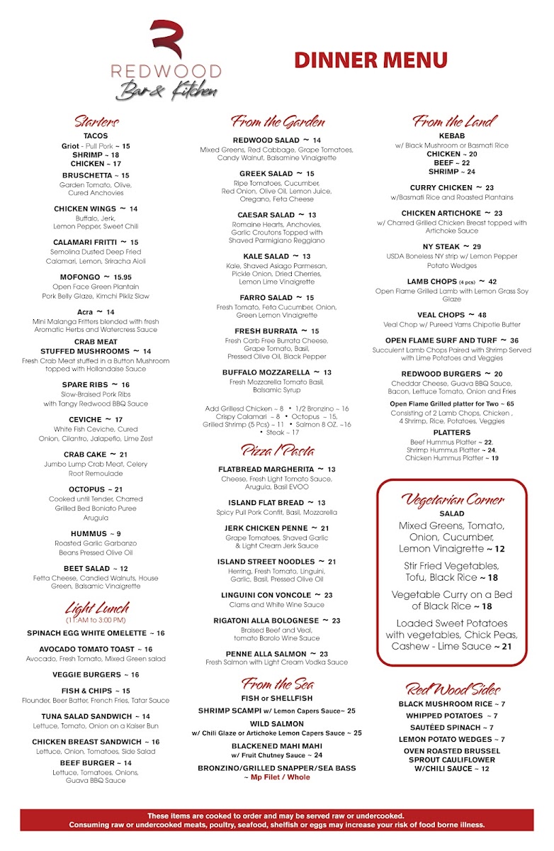 From a reviewer’s perspective, the menu at Redwood Bar & Kitchen offers an impressively broad and well-balanced culinary journey that brings together comfort food, global flavors, and a strong beverage program, making it suitable for everything from a relaxed breakfast to a full dinner experience. The day can begin with hearty breakfast options such as HOLLYWOOD SLAM, GARDEN OMELET, GREEK OMELET, or HAM AND CHEESE OMELET, paired perfectly with classic drinks like EXPRESSO, COFFEE LATTE, CAPPUCCINO, ICED COFFEE, or refreshing choices such as ORANGE JUICE and PINEAPPLE JUICE. As the menu transitions into lunch and dinner, the starters immediately set a high standard, with crowd-pleasers like BRUSCHETTA, CRAB CAKE, OCTOPUS, CALAMARI FRITTI, and CEVICHE showcasing both freshness and creativity. Salad lovers are well taken care of with options from the garden including GREEK SALAD, CAESAR SALAD, FRESH BURRATA, KALE SALAD, and FARRO SALAD, while pizza and pasta selections such as MARGUERITA, ISLAND FLAT BREAD PIZZA, ISLAND STREET NOODLES, JERK CHICKEN PENNE PASTA, and LINGUINI CON VONGOLE add comforting yet flavorful choices. The main courses extend confidently across land and sea, featuring dishes like CHICKEN KABAB, BEEF KABAB, SHRIMP KEBAB, CURRY CHICKEN, LAMB CHOPS, alongside seafood highlights including WILD SALMON, BRANZINO, GRILLED SNAPPER SHRIMP, and BLACKED MAHI MAHI, all complemented by satisfying sides such as WHIPPED POTATOES, BRUSSEL SPROUT & CAULIFLOWER, SAUTEED SPINACH, BLACK MUSHROOM RICE, and WEDGE POTATO. Vegetarian diners are not an afterthought here, with a dedicated corner offering dishes like STIR FRIED VEGETABLES, TOFU, VEGETABLE CURRY ON A BED OF BLACK RICE, and LOADED SWEET POTATOES WITH VEGETABLES, CHICK PEAS, CASHEW - LIME SAUCE. To end on a sweet note, desserts such as COCONUT CREME BRULEE, AMARETTO LAVA CHOCOLATE CAKE, ROASTED PLANTAIN BREAD PUDDING, BOULET DE BEIGNETS, and TIRAMISSU deliver indulgent finales. Rounding everything out is a strong drinks menu, from cocktails like FRUITY MOJITO, HAVANA MOJITO, PINA COLADA, LYCHEE MARTINI, and PASSION FRUIT MARTINI, to beers such as BUD LIGHT, PERONI, HEINEKEN, and CORONA, as well as wines by the glass or bottle including MOSCATO, CHARDONNARY, CABERNET SAUVIGNON, and SAUVIGNON BLANC-ultimately making Redwood Bar & Kitchen a versatile destination where variety, balance, and approachability define the menu.