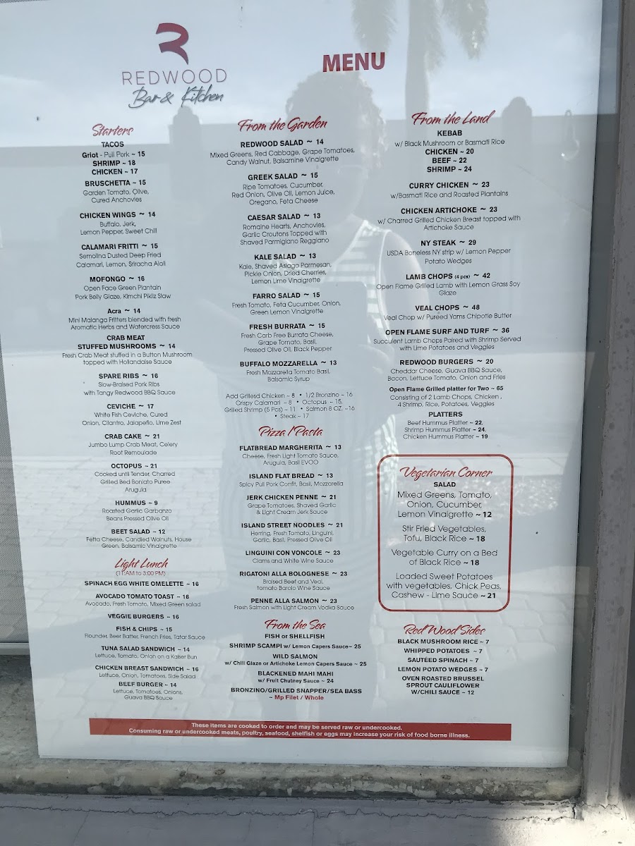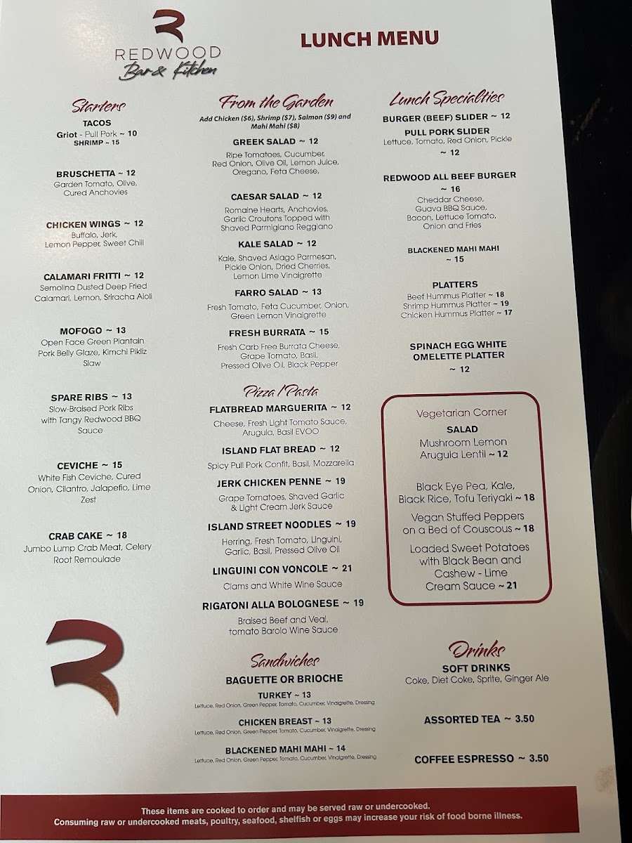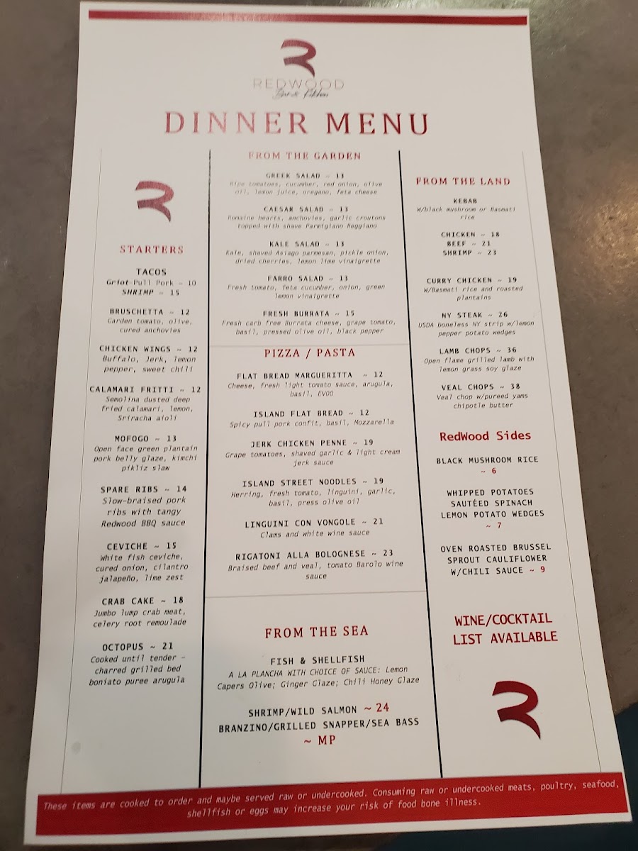 From a reviewer’s perspective, the menu at Redwood Bar & Kitchen offers an impressively broad and well-balanced culinary journey that brings together comfort food, global flavors, and a strong beverage program, making it suitable for everything from a relaxed breakfast to a full dinner experience. The day can begin with hearty breakfast options such as HOLLYWOOD SLAM, GARDEN OMELET, GREEK OMELET, or HAM AND CHEESE OMELET, paired perfectly with classic drinks like EXPRESSO, COFFEE LATTE, CAPPUCCINO, ICED COFFEE, or refreshing choices such as ORANGE JUICE and PINEAPPLE JUICE. As the menu transitions into lunch and dinner, the starters immediately set a high standard, with crowd-pleasers like BRUSCHETTA, CRAB CAKE, OCTOPUS, CALAMARI FRITTI, and CEVICHE showcasing both freshness and creativity. Salad lovers are well taken care of with options from the garden including GREEK SALAD, CAESAR SALAD, FRESH BURRATA, KALE SALAD, and FARRO SALAD, while pizza and pasta selections such as MARGUERITA, ISLAND FLAT BREAD PIZZA, ISLAND STREET NOODLES, JERK CHICKEN PENNE PASTA, and LINGUINI CON VONGOLE add comforting yet flavorful choices. The main courses extend confidently across land and sea, featuring dishes like CHICKEN KABAB, BEEF KABAB, SHRIMP KEBAB, CURRY CHICKEN, LAMB CHOPS, alongside seafood highlights including WILD SALMON, BRANZINO, GRILLED SNAPPER SHRIMP, and BLACKED MAHI MAHI, all complemented by satisfying sides such as WHIPPED POTATOES, BRUSSEL SPROUT & CAULIFLOWER, SAUTEED SPINACH, BLACK MUSHROOM RICE, and WEDGE POTATO. Vegetarian diners are not an afterthought here, with a dedicated corner offering dishes like STIR FRIED VEGETABLES, TOFU, VEGETABLE CURRY ON A BED OF BLACK RICE, and LOADED SWEET POTATOES WITH VEGETABLES, CHICK PEAS, CASHEW - LIME SAUCE. To end on a sweet note, desserts such as COCONUT CREME BRULEE, AMARETTO LAVA CHOCOLATE CAKE, ROASTED PLANTAIN BREAD PUDDING, BOULET DE BEIGNETS, and TIRAMISSU deliver indulgent finales. Rounding everything out is a strong drinks menu, from cocktails like FRUITY MOJITO, HAVANA MOJITO, PINA COLADA, LYCHEE MARTINI, and PASSION FRUIT MARTINI, to beers such as BUD LIGHT, PERONI, HEINEKEN, and CORONA, as well as wines by the glass or bottle including MOSCATO, CHARDONNARY, CABERNET SAUVIGNON, and SAUVIGNON BLANC-ultimately making Redwood Bar & Kitchen a versatile destination where variety, balance, and approachability define the menu.